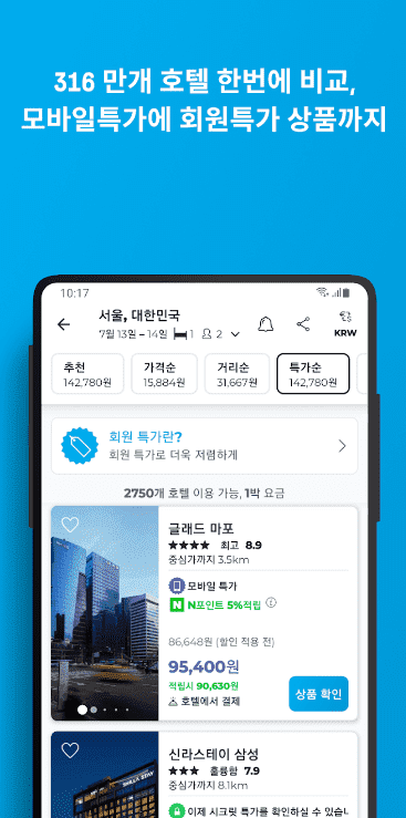 호텔 검색이 똑똑해진다! 서울, 부산, 제주, 오사카, 홍콩, 뉴욕…호텔스컴바인과 함께라면 어디든 갈 수 있습니다.
