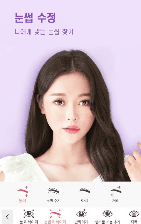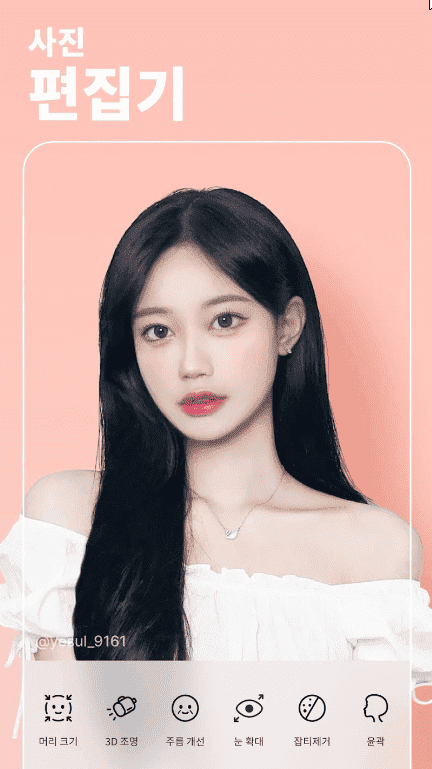 - 자동 얼굴인식(AR) 성형 미용 기능(눈크게/스마일/갸름하게) - V라인 터치성형, 메이크업을 한 듯 완벽한 피부 표현 기능(미백/화이트닝/컨실러) - 볼륨 UP 몸매보정 (키늘리기/개미허리/힙업/일자다리) - 스티커 붙이듯 손쉽게 사용! 200종의 헤어, 메이크업 뷰티 아이템 + 메이크업을 하지 않아도, 다양한 아이템과 기능으로 메이크업 한 효과를 만들어 보세요!