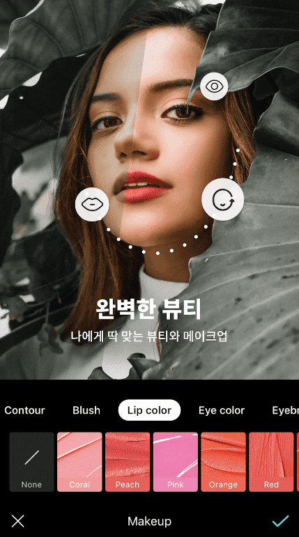 - AR 메이크업 : 데일리부터 트렌디 메이크업까지 자연스러운 룩을 연출하세요, 뷰티와 메이크업은 나에게 어울리도록 조절해 사용할 수 있어요.