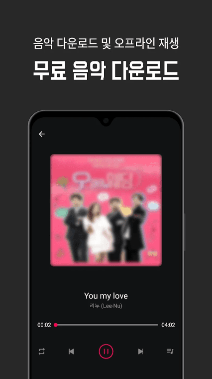 앱 내에서 음악청취 시 다운로드를 하지 않더라도 본 앱의 기본 재생 플레이어를 사용하여 재생 가능하며 다른 앱을 사용하는 동안에도 음악을 계속 재생할 수 있습니다.