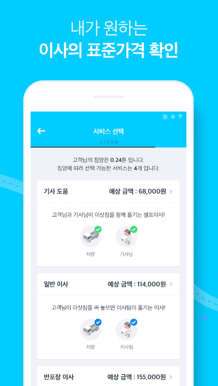 - 포장이사, 반포장이사, 일반이사, 보관이사 등 원하는 서비스를 선택하세요.