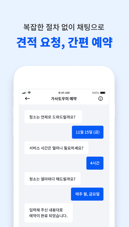 - 대화 형식으로 간편하게 요청하고, 시장가보다 저렴한 이사를 예약하세요.