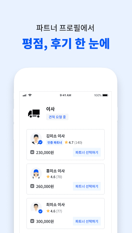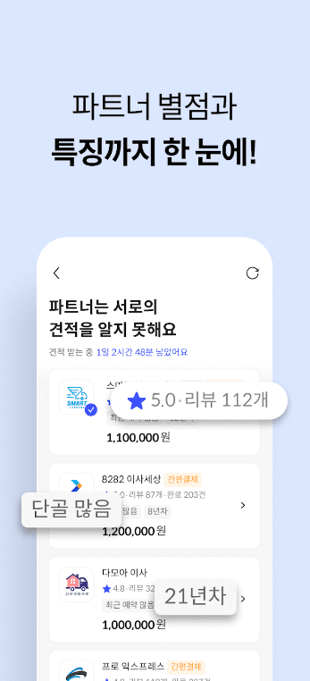 - 이사 파트너의 실제 고객 후기와 평점을 프로필에서 확인해보세요.