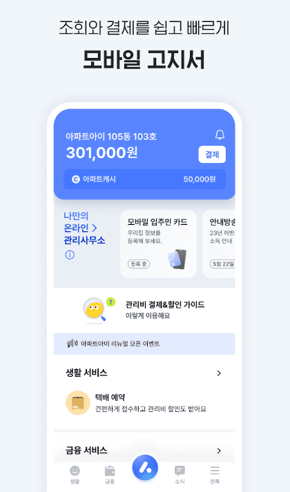 관리비와 월세 자동이체 신청과 택배 예약, 아파트아이 회원만 가능한 금융상품 추천과 할인 이벤트까지 다양한 생활/금융 서비스를 만나볼 수 있어요.
