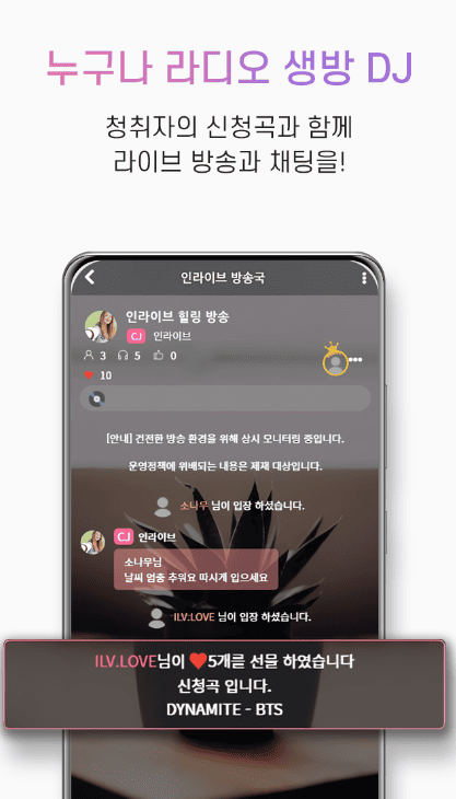**인라이브**는 방송을 원하는 크리에이터뿐만 아니라 청취자에게도 특별한 경험을 선사합니다. 언제 어디서든 24시간 끊김없이 음악을 들으며, DJ와 소통하고, 신청곡을 보내는 재미가 있습니다. 그럼 이제, 인라이브에서 나만의 방송과 청취의 재미를 만나보세요!