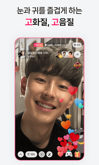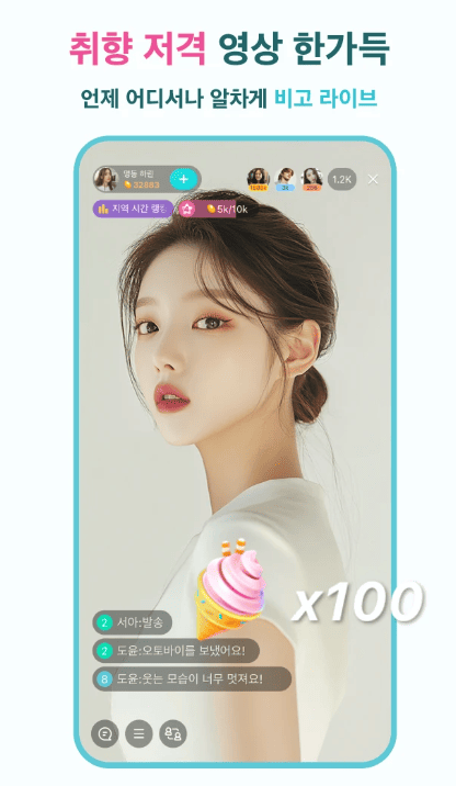 라이브 방송: 언제든지 라이브 방송을 시작하고, 전 세계의 재능 있는 방송인들과 실시간 방송을 즐길 수 있어요. 춤, 노래, 토크쇼 등 다양한 장르의 라이브 방송이 제공됩니다. 방송 중 실시간 채팅을 통해 더 많은 사람들과 소통하세요.