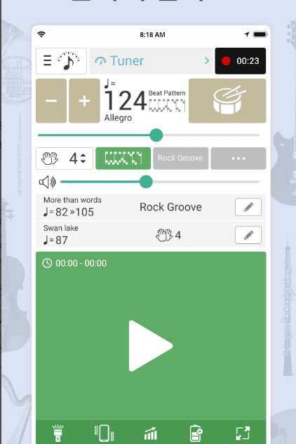 또한 기타나 피아노 같은 대중적인 악기는 물론 첼로 플루트 트럼펫 등 거의 모든 악기를 지원하여 장르와 악기에 구애받지 않고 누구나 사용할 수 있습니다. 자동으로 템포를 올려주며 속주 연습을 돕는 스피드 트레이너 기능과 연습 시간을 기록해주는 기능까지 갖추고 있어 체계적인 연습 관리가 가능합니다. 이 모든 것을 하나의 앱에서 무료로 경험해 보세요.