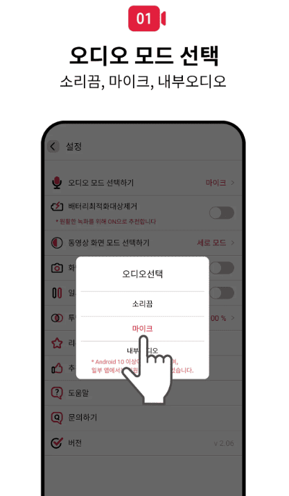 영상에 생동감을 더하고 싶다면 페이스캠(Facecam) 기능을 활용해 보세요. 화면 한쪽에 작은 창으로 내 얼굴과 리액션을 함께 담을 수 있어 시청자와 소통하는 느낌을 줄 수 있습니다. 오디오 측면에서도 내부 오디오 녹음(안드로이드 10 이상)을 완벽하게 지원하여 외부 잡음 없이 게임 사운드나 영상 소리만을 깨끗하게 추출해 냅니다. 물론 필요에 따라 외부 마이크를 켜서 내 목소리를 함께 설명으로 넣을 수도 있습니다.