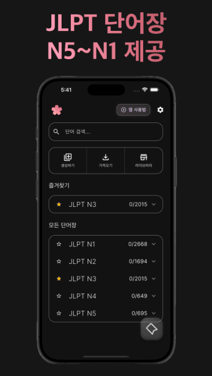 공부하다가 유독 외워지지 않거나 마음에 드는 표현을 발견했다면 내 단어에 추가하여 나만의 단어장을 꾸려보세요. 이렇게 선별된 단어들을 집중적으로 공략하다 보면 어느새 JLPT 합격권에 들어선 자신의 실력을 확인하게 될 것입니다. 맛집에서 맛있는 음식을 골라 먹듯 재미와 실력을 동시에 챙기고 싶은 분들에게 이 앱은 최고의 선택지가 되어줄 것입니다.
