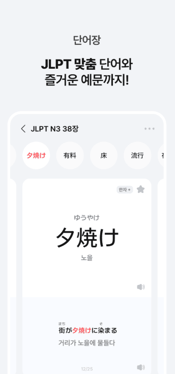 콘텐츠의 질적인 측면에서도 매우 알차게 구성되어 있습니다. 초급부터 고급까지 수준별 단어장이 세분화되어 있어 내 실력에 딱 맞는 단계부터 시작할 수 있으며, 단순히 단어 뜻만 알려주는 것이 아니라 현지인이 직접 작성한 예문을 제공합니다. 이를 통해 실제 일본 생활에서 쓰이는 살아있는 표현과 뉘앙스를 정확하게 파악할 수 있다는 점이 큰 장점입니다.