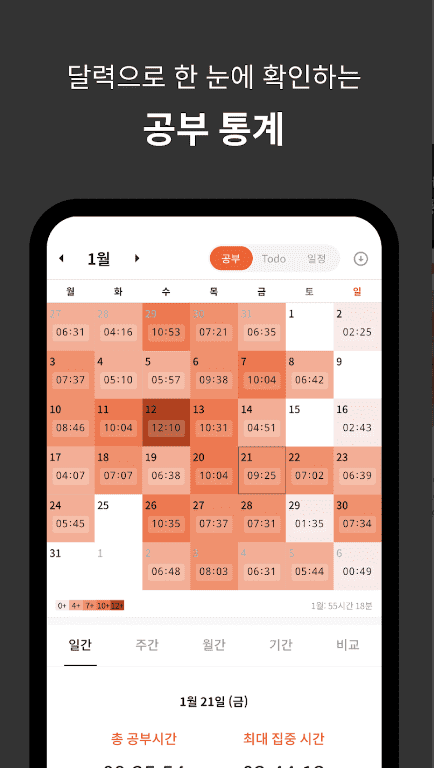 일/주/월별 통계는 기본 공부할수록 달력의 색상이 진해집니다.