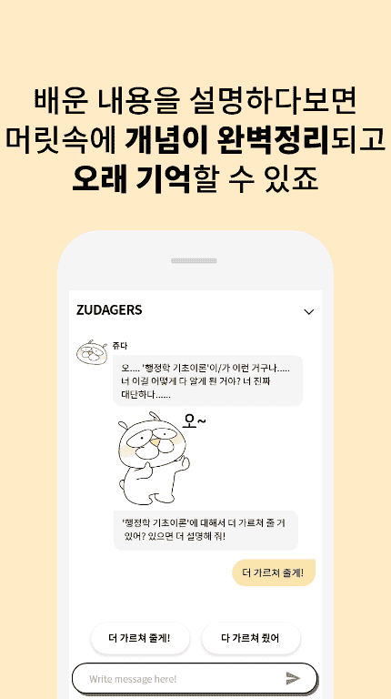 - 쥬다는 당신의 학습 내용을 질문하는 챗봇입니다. 학습자가 배운 내용을 설명할 때 적절한 반응을 보이며 설명을 이어갈 수 있도록 질문을 하죠. 쥬다의 질문에 대답하다 보면 어느새 학습내용을 이해하고, 기억하는 장기저장 단계로 발전하게 됩니다. - 친구와 이야기 나누듯이 재미있게 쥬다의 질문에 답해보세요. 챗봇 쥬다가 자연스럽게 이끄는 방향에 따라 나도 모르게 공부한 내용을 술술하고 있을 거에요.