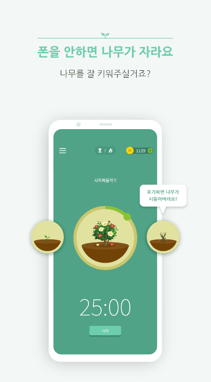 ■ 🏃어느새 폰과 멀어지는 순간을 만나보세요. 폰의 유혹에서 견디지 못하고 다른 앱을 실행하거나 포기버튼을 누르는 순간 생생하게 자라나던 사랑스러운 나무는 말라 죽게 됩니다.. 집중을 게임(Gamification)처럼 나무를 심으며 내 숲이 만들어지는 모습을 볼 수 있습니다. #미루는버릇극복하기 #생산성효율높이기 #스마트폰에서벗어나기