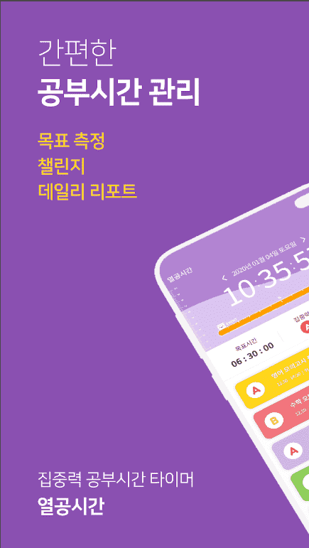 열공시간 앱은 고등, 수능, 고시, 자격증 등 공부 시간 관리가 필요한 사람들에게 도움을 주는 앱입니다. 순수공부 시간을 측정하는 것으로 집중력 향상 및 효율적 시간 관리를 가능하게 해줍니다.